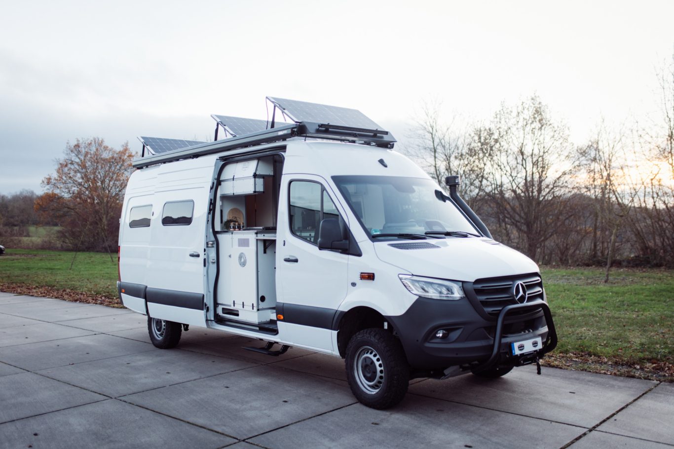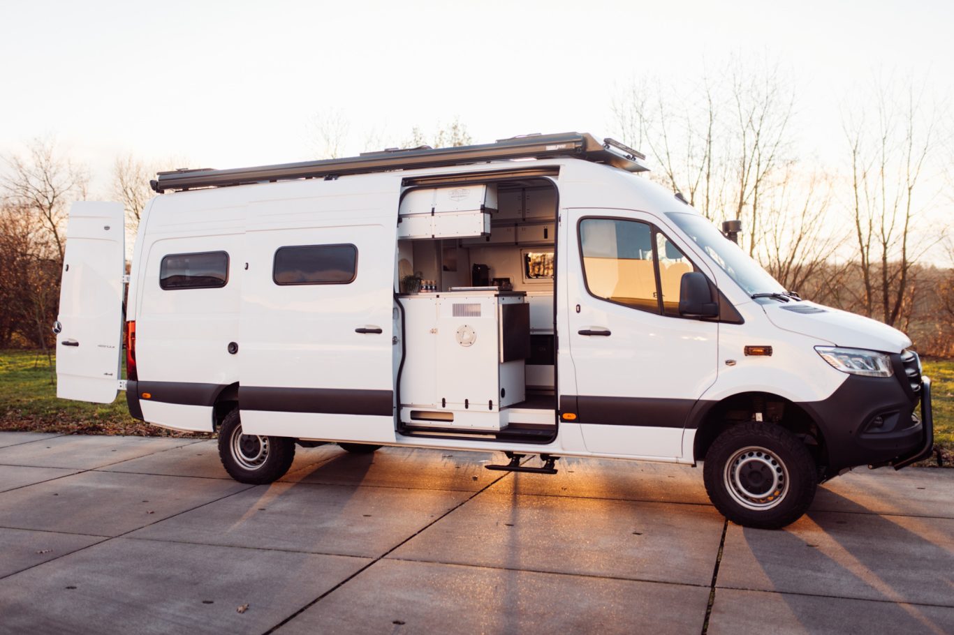Die integrierte Solaranlage liefert Strom, auch fernab der Zivilisation. Die begehbare Dachterrasse lädt zum Entspannen ein – egal ob für den Morgenkaffee mit Aussicht oder den Sundowner über den Bergen.