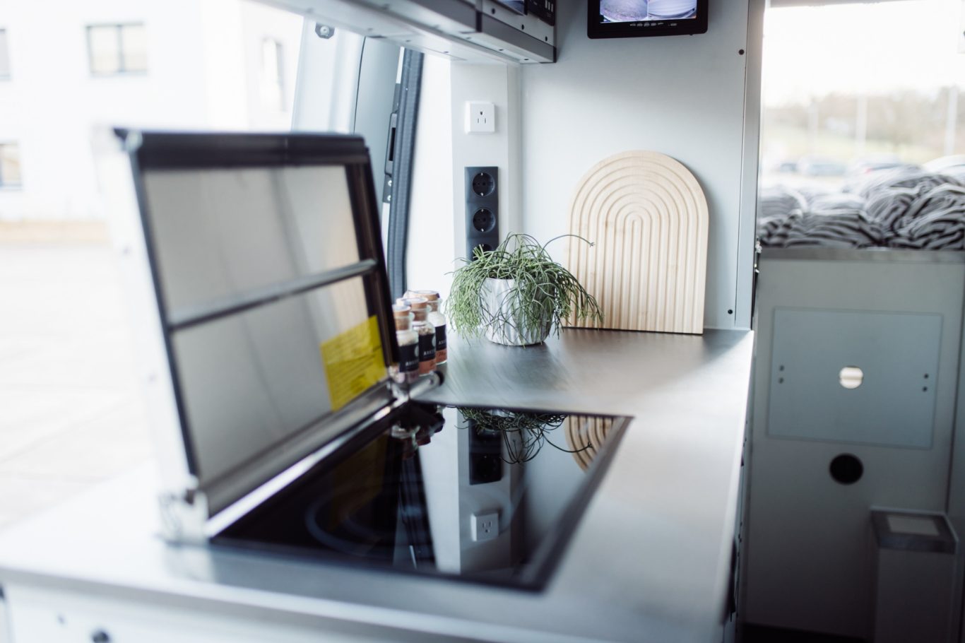 Maximale Autarkie: Dank drei ausrichtbarer Solarpanels lässt sich jeder Sonnenstrahl effizient einfangen. Gekocht wird ganz ohne Gas auf einem modernen Dieselkochfeld, welches optional als Heizung genutzt werden kann.