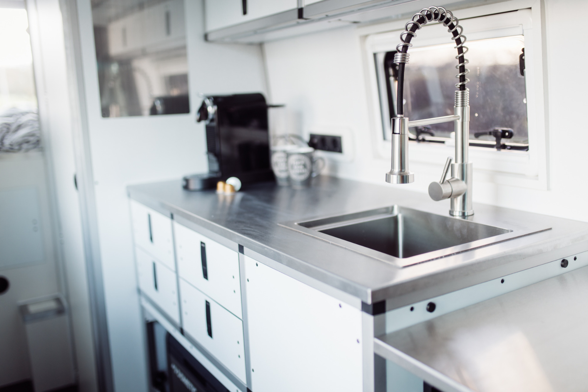 Leichtbau-Interieur: Der gesamte Innenausbau basiert auf einem hochstabilen Aluprofil-Möbelsystem. Das spart Gewicht, sorgt für maximale Langlebigkeit und bietet einen cleanen, modernen Look.